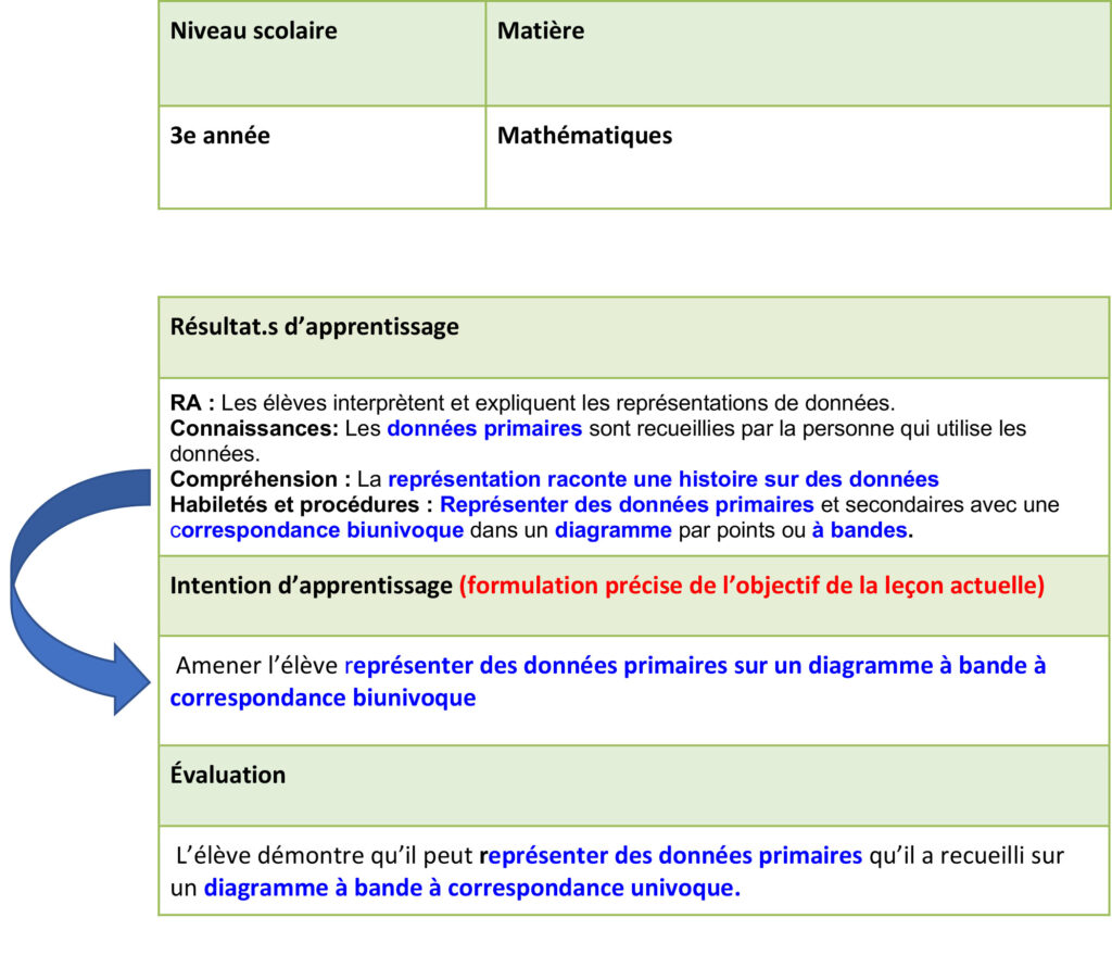 Les résultats d’apprentissage décrivent ce que les élèves doivent savoir, comprendre et être capables de faire à la fin d’une année scolaire. La réussite scolaire des élèves doit être évaluée et communiquée (Alberta Education, 2020).