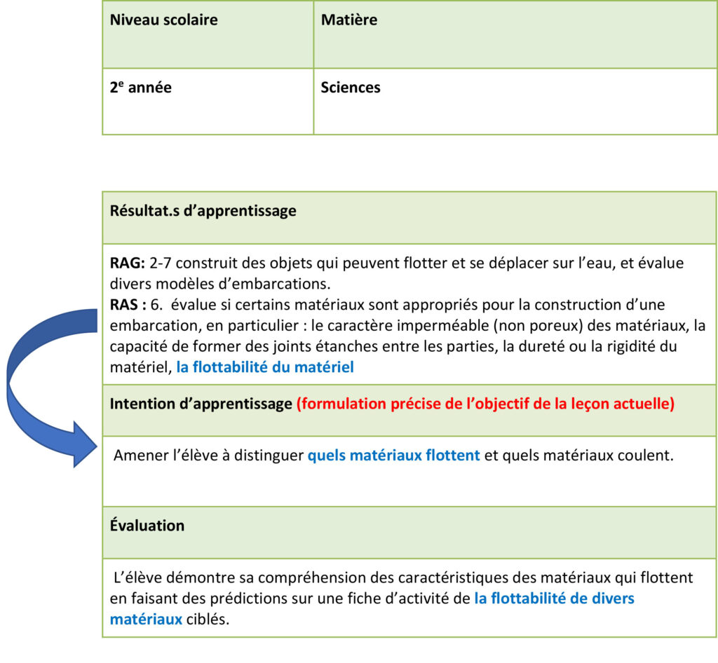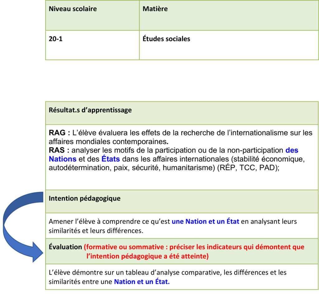 L’intention pédagogique est le but à atteindre durant l’activité ciblé (Parent, 2012). C’est la formulation de l’élément spécifique en lien avec le résultat d’apprentissage sur lequel porte la leçon développée.
