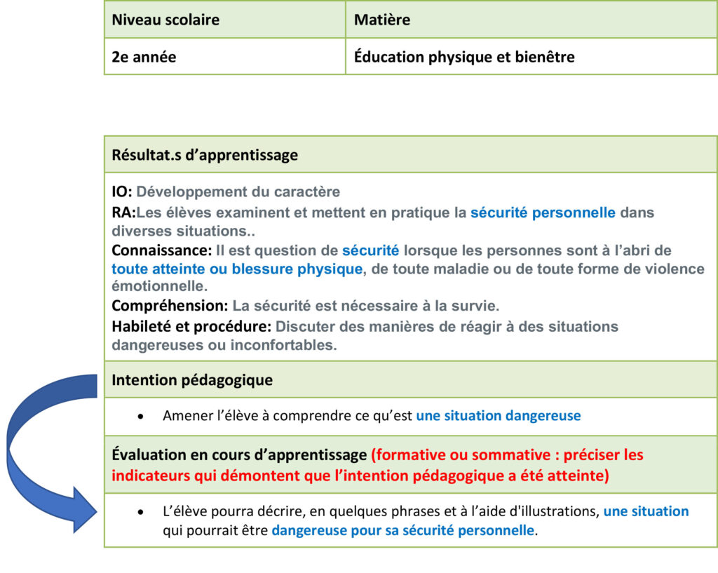 La prévision en amont de l’évaluation permet de préciser et de définir les preuves ou indicateurs qui démontrent que les élèves ont atteint, ou non, l’intention pédagogique (Leroux et Mastracci, 2015). On distingue donc au préalable un niveau d’atteinte acceptable de réussite de l’intention pédagogique ciblée.